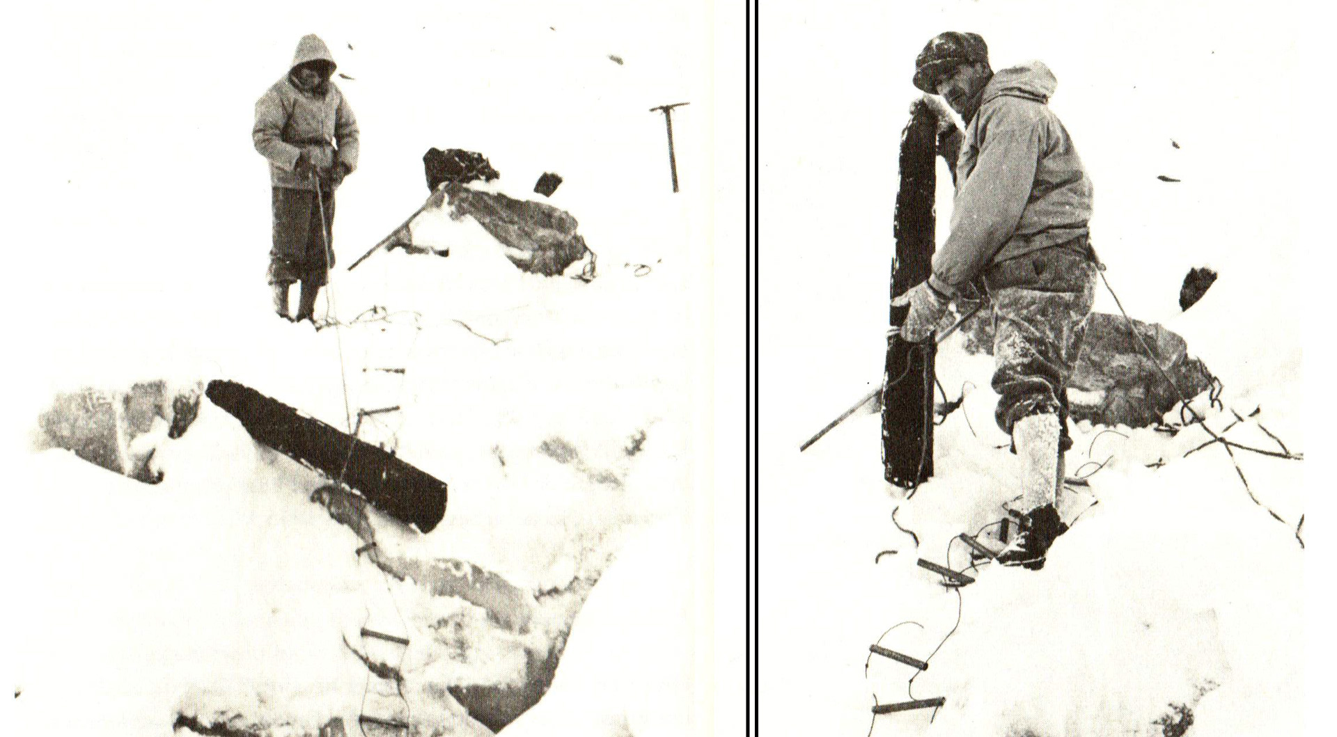 1. Abstieg in die Gletscherspalte durch Fernand Navarra mit Entdeckung des Holzes, er fotografiert den Fund.