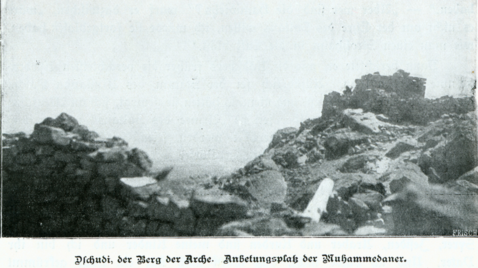 >Das im Buch abgebildete Foto ist untertitelt mit: »Dschudi, der Berg der Arche. Anbetungsplatz der Muhammedaner.« Es ist das erste Bild vom Landeplatz der Arche.
